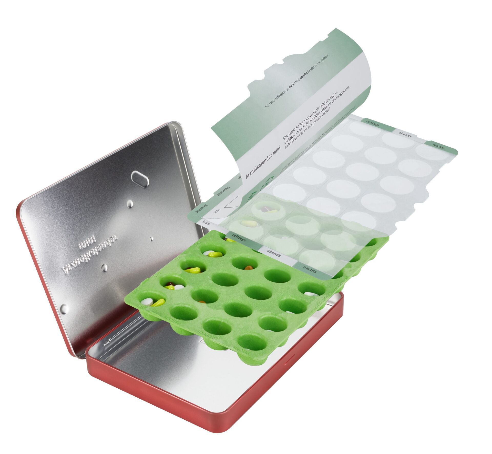 Die optisch ansprechenden und langlebigen Metalldosen schützen den Inhalt des Arzneikalenders sicher und zuverlässig.